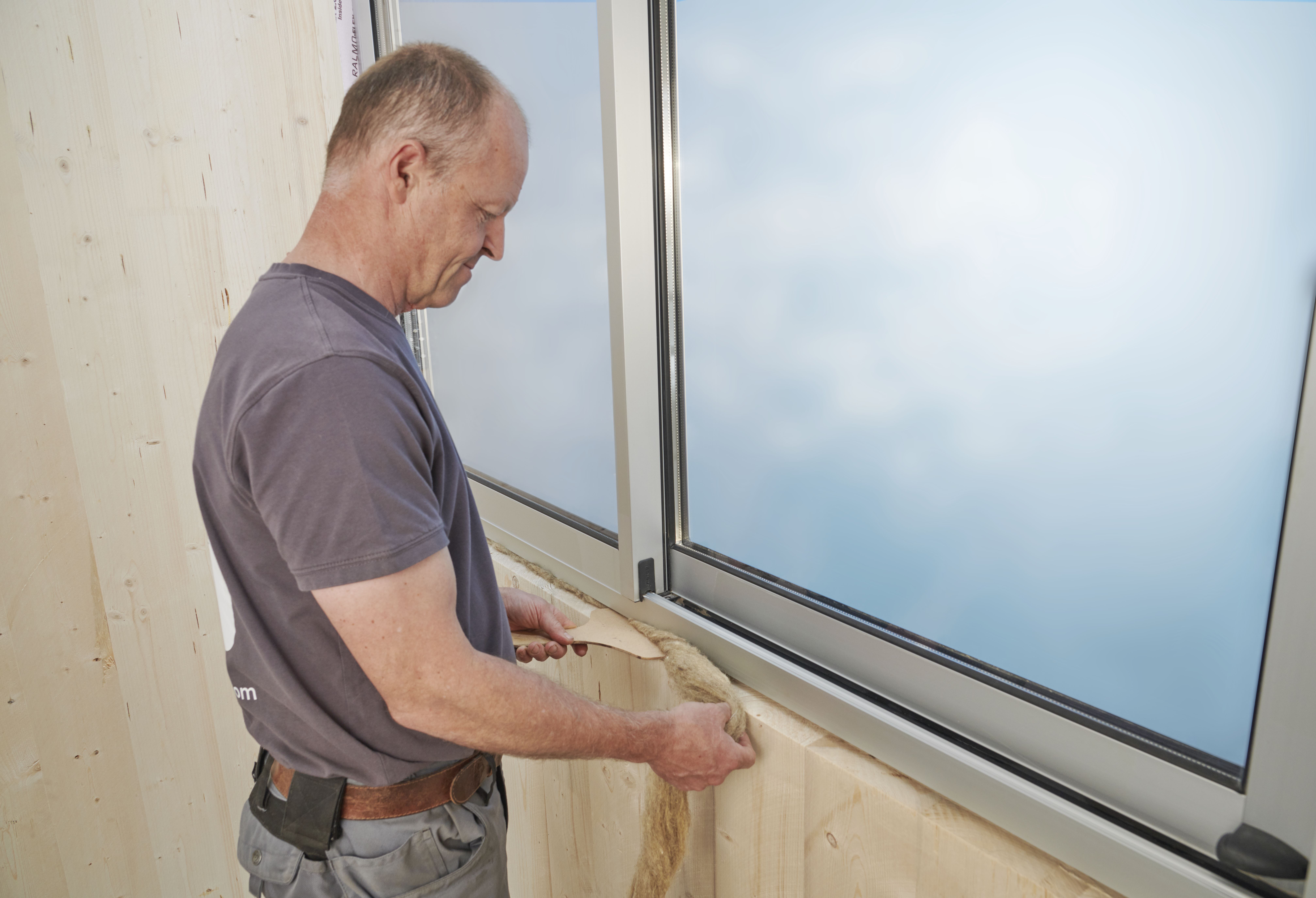 Zur Bearbeitung Fugenband mit eine Spachtel in die Fuge schieben. Durch das hohe Füllvolumen ist die Fuge optimal gedämmt, die Schafwolle füllt jeden Hohlraum.